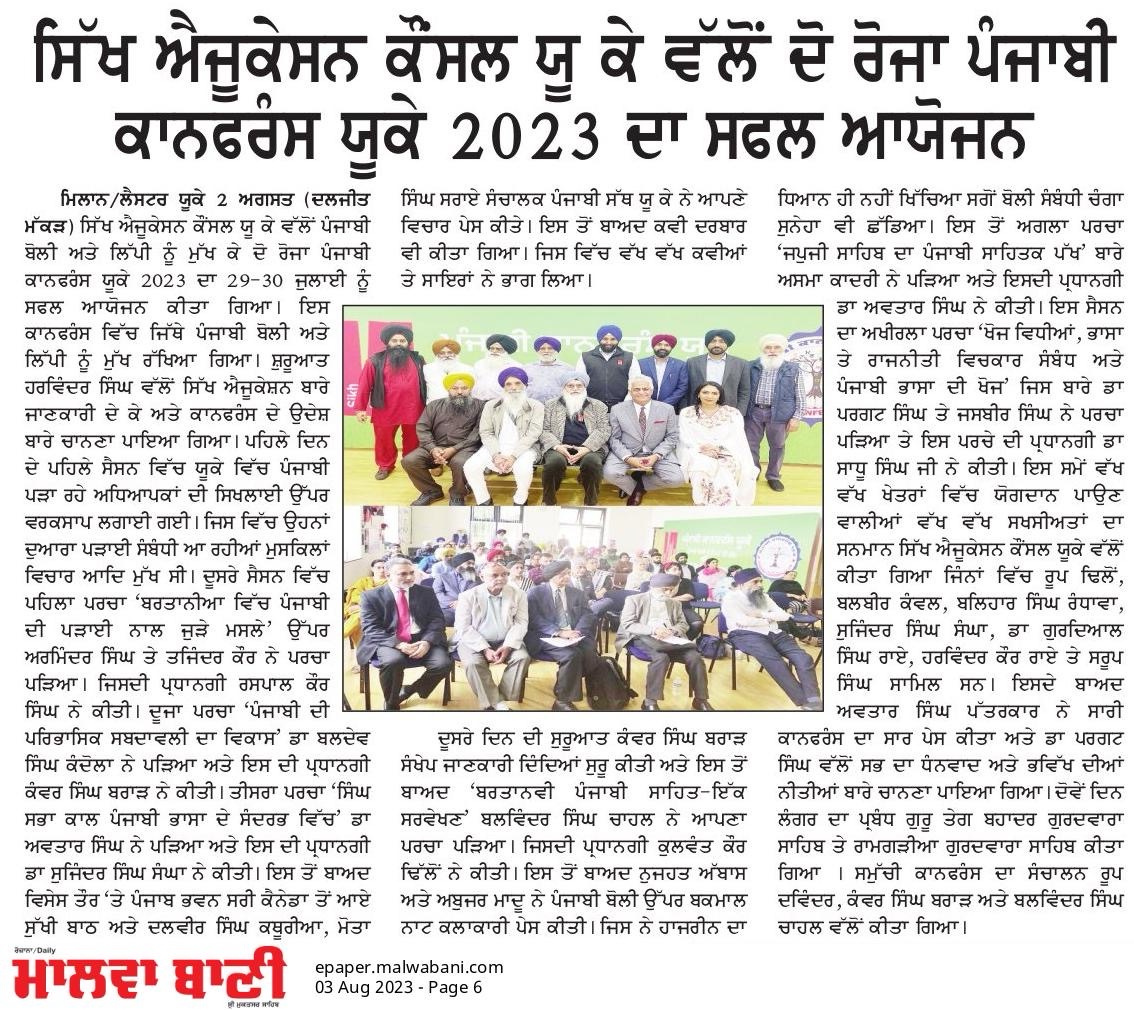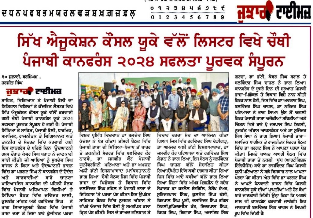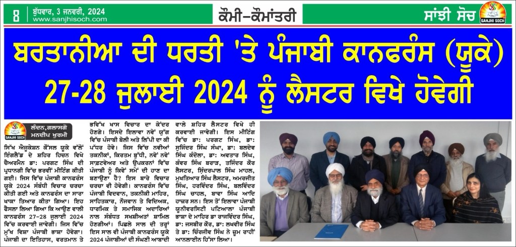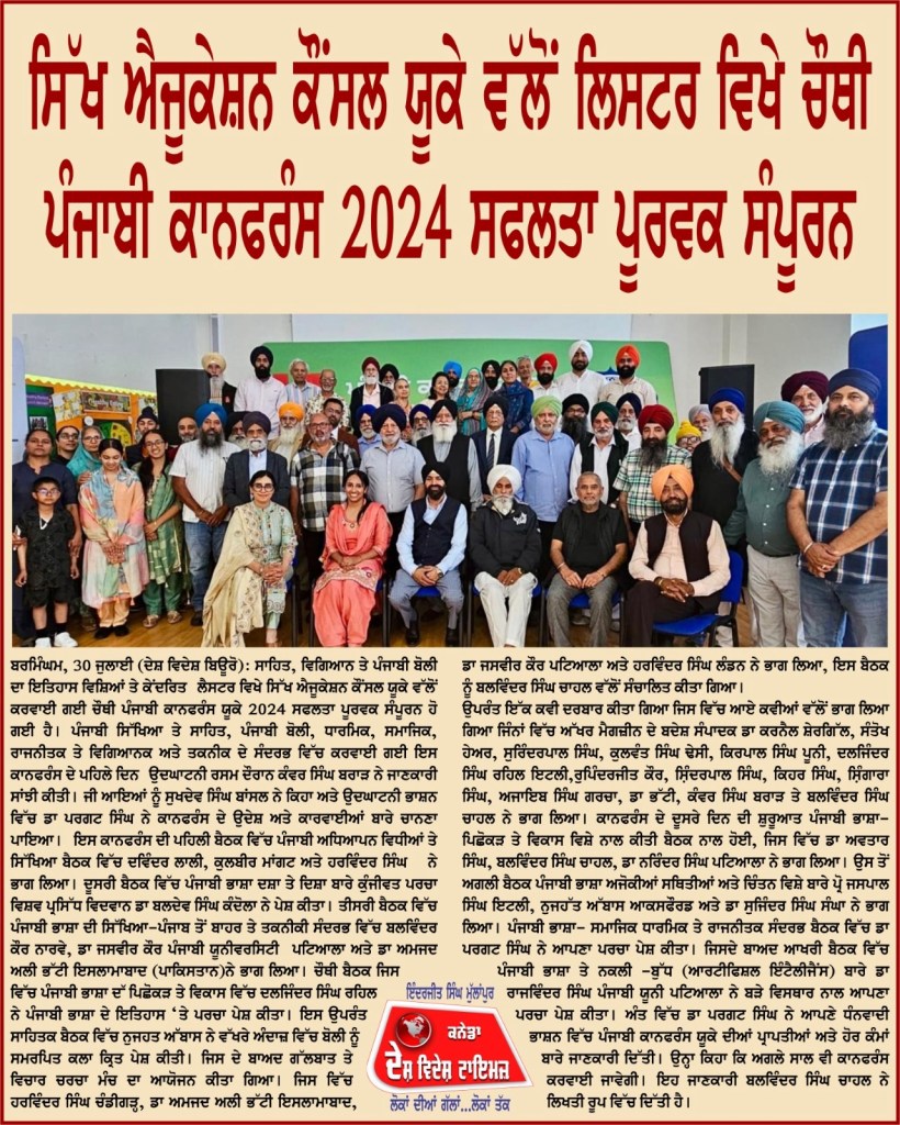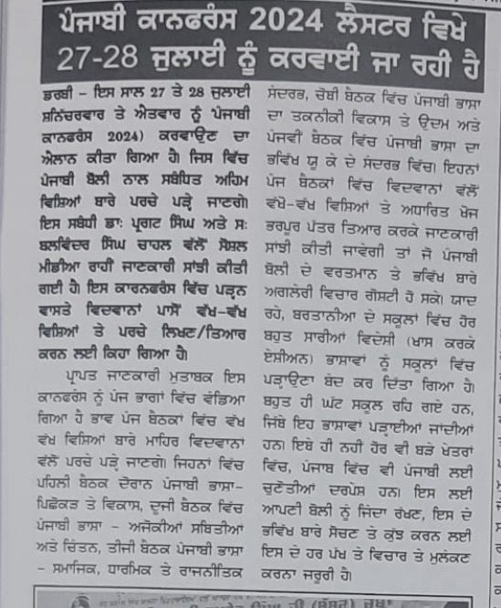 ਲੰਦਨ () ਇੰਗਲੈਂਡ ਦੇ ਪ੍ਰਸਿੱਧ ਸ਼ਹਿਰ ਲੈਸਟਰ ਵਿੱਚ ਜੁਲਾਈ ਮਹੀਨੇ 27 ਅਤੇ 28 ਤਾਰੀਖ ਨੂੰ ਕਰਵਾਈ ਜਾਣ ਵਾਲੀ ਪੰਜਾਬੀ ਕਾਨਫਰੰਸ 2024 ਦਾ ਪੋਸਟਰ ਸਿੱਖ ਐਜੂਕੇਸ਼ਨ ਕੌਂਸਲ ਵੱਲੋਂ ਜਾਰੀ ਕੀਤਾ ਗਿਆ।