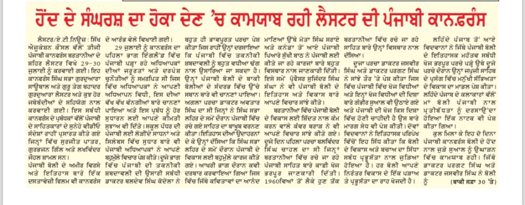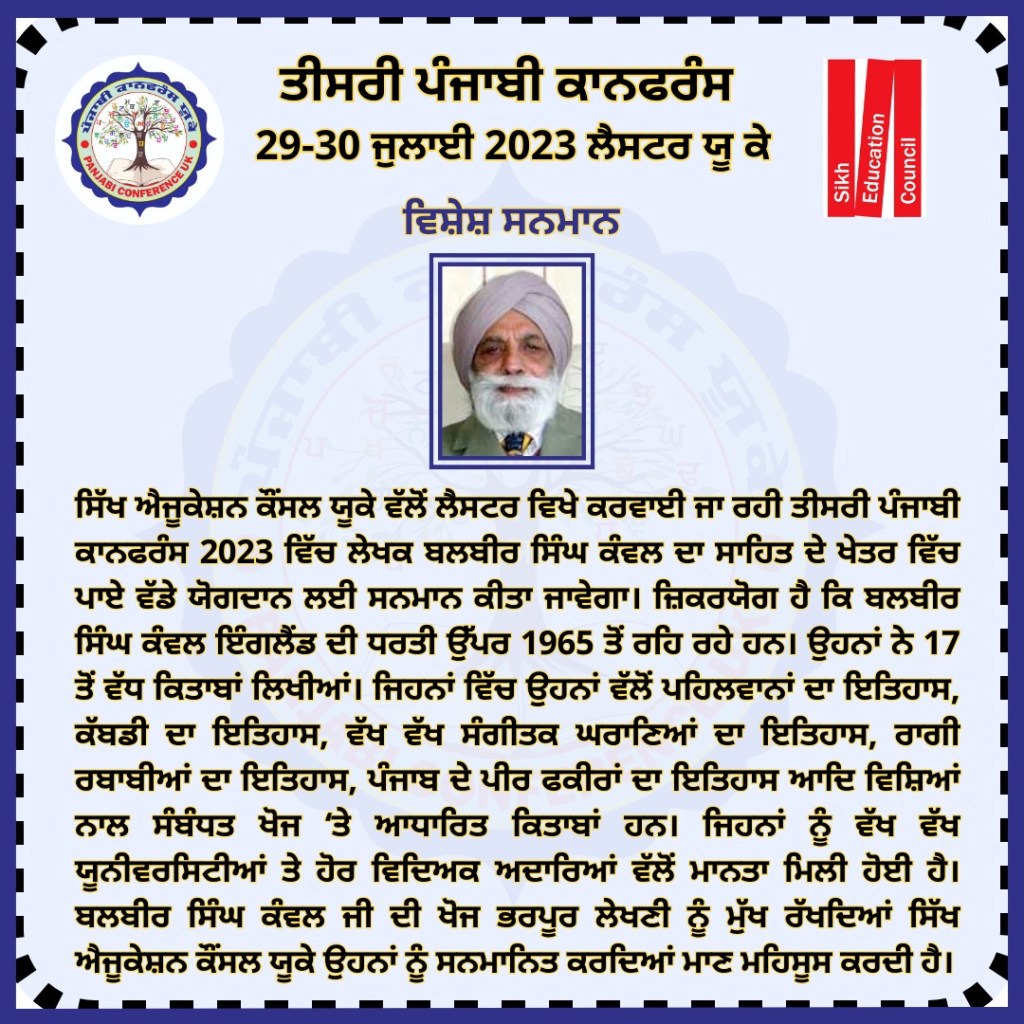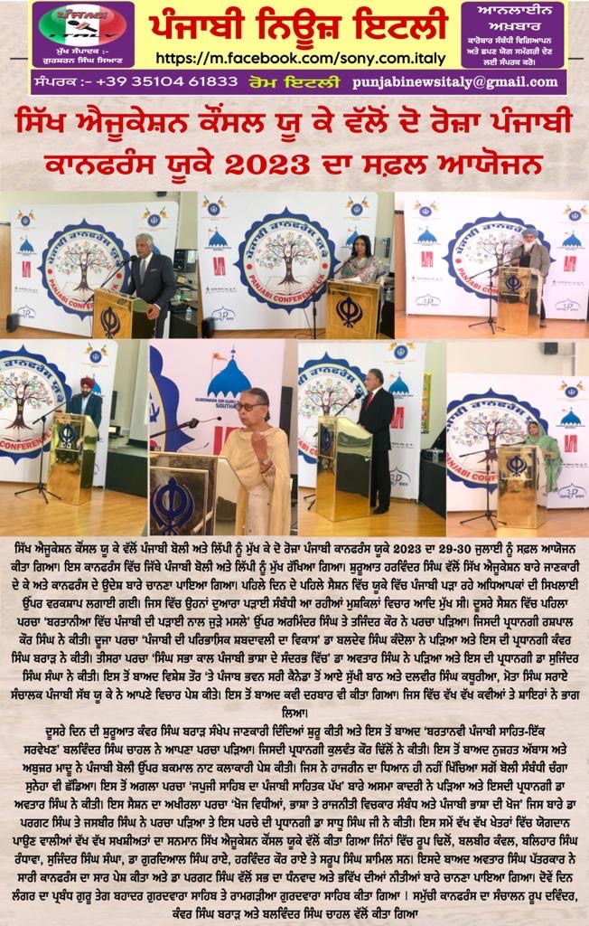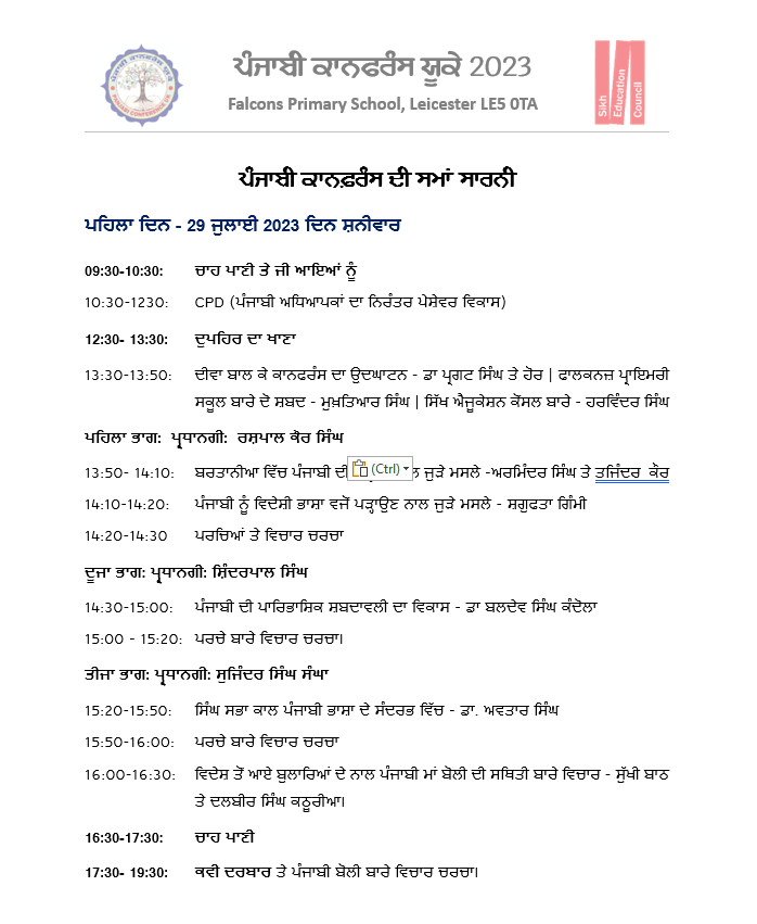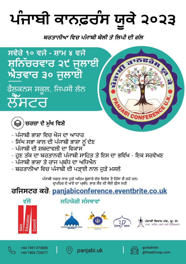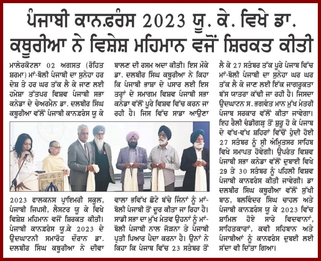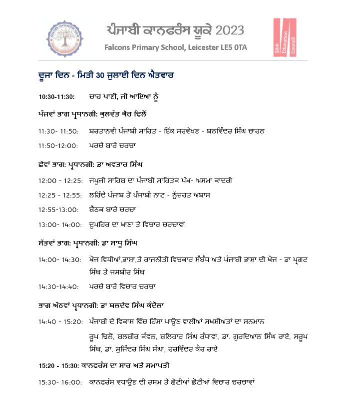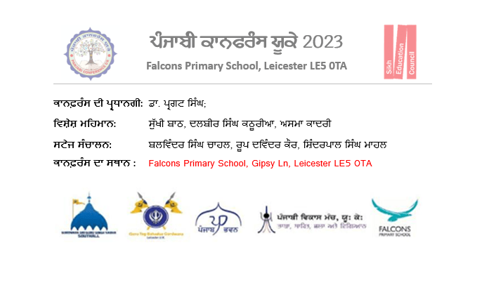 ਪੰਜਾਬੀ ਕਾਨਫ਼ਰੰਸ ਯੂਕੇ 2023 ਪੰਜਾਬੀ ਕਾਨਫਰੰਸ ਯੂਕੇ 2023 ਵਿੱਚ ਪੜ੍ਹੇ ਗਏ ਪਰਚੇ ਕਾਨਫ਼ਰੰਸ ਦਾ ਸਥਾਨ : Falcons Primary School, Gipsy Ln, Leicester LE5 0TA ਪੰਜਾਬੀ ਦੇ ਵਿਕਾਸ ਵਿੱਚ ਹਿੱਸਾ ਪਾਉਣ ਵਾਲੀਆਂ ਸ਼ਖ਼ਸੀਅਤਾਂ ਦਾ ਸਨਮਾਨ ਕੀਤਾ ਗਿਆ। ਪੰਜਾਬੀ ਕਾਨਫਰੰਸ ਯੂਕੇ 2023 ਵਿੱਚ ਪੜ੍ਹੇ ਗਏ ਪਰਚੇ ਪੰਜਾਬੀ ਕਾਨਫਰੰਸ ਯੂਕੇ ਮੁੱਖ ਪੰਨਾ