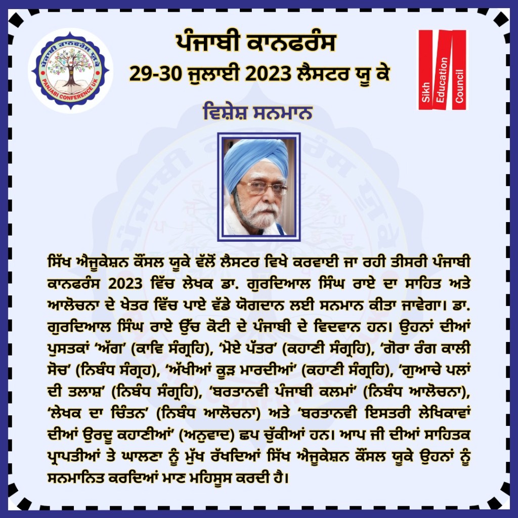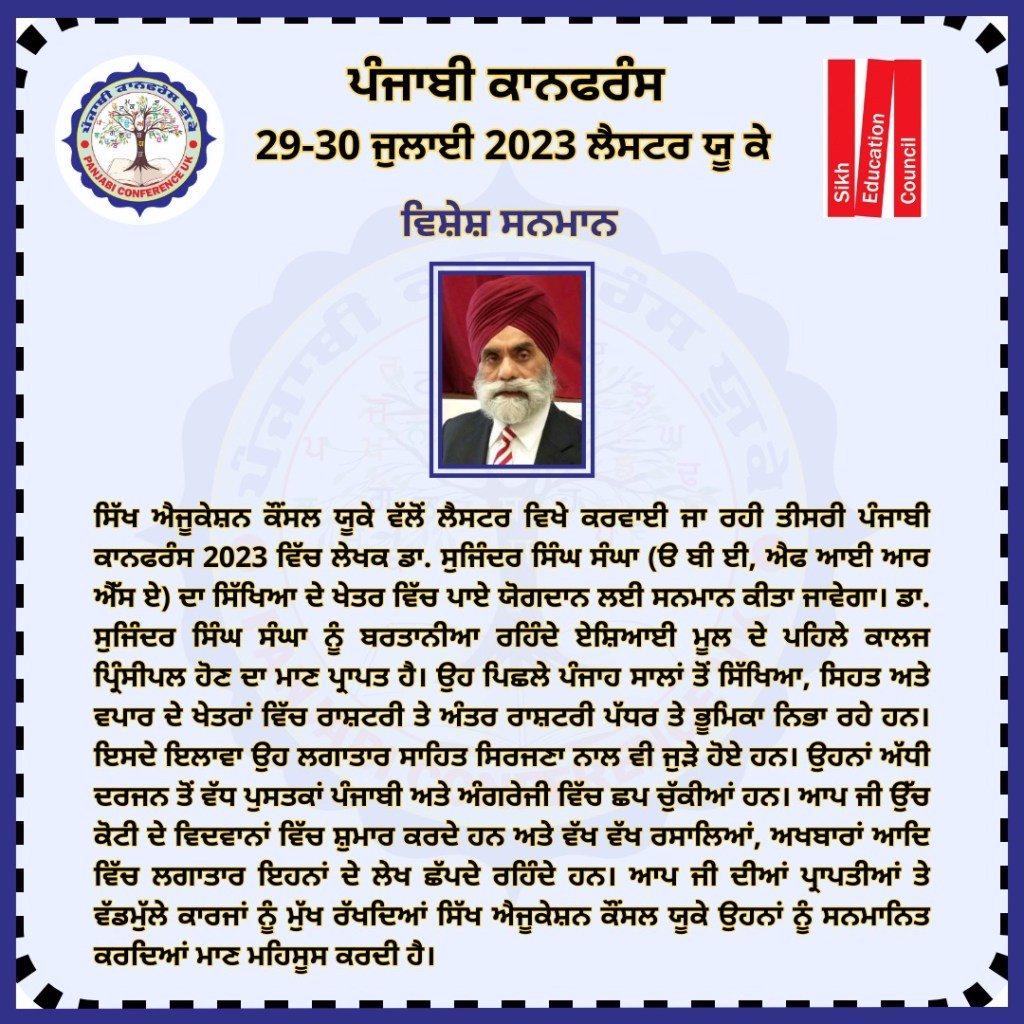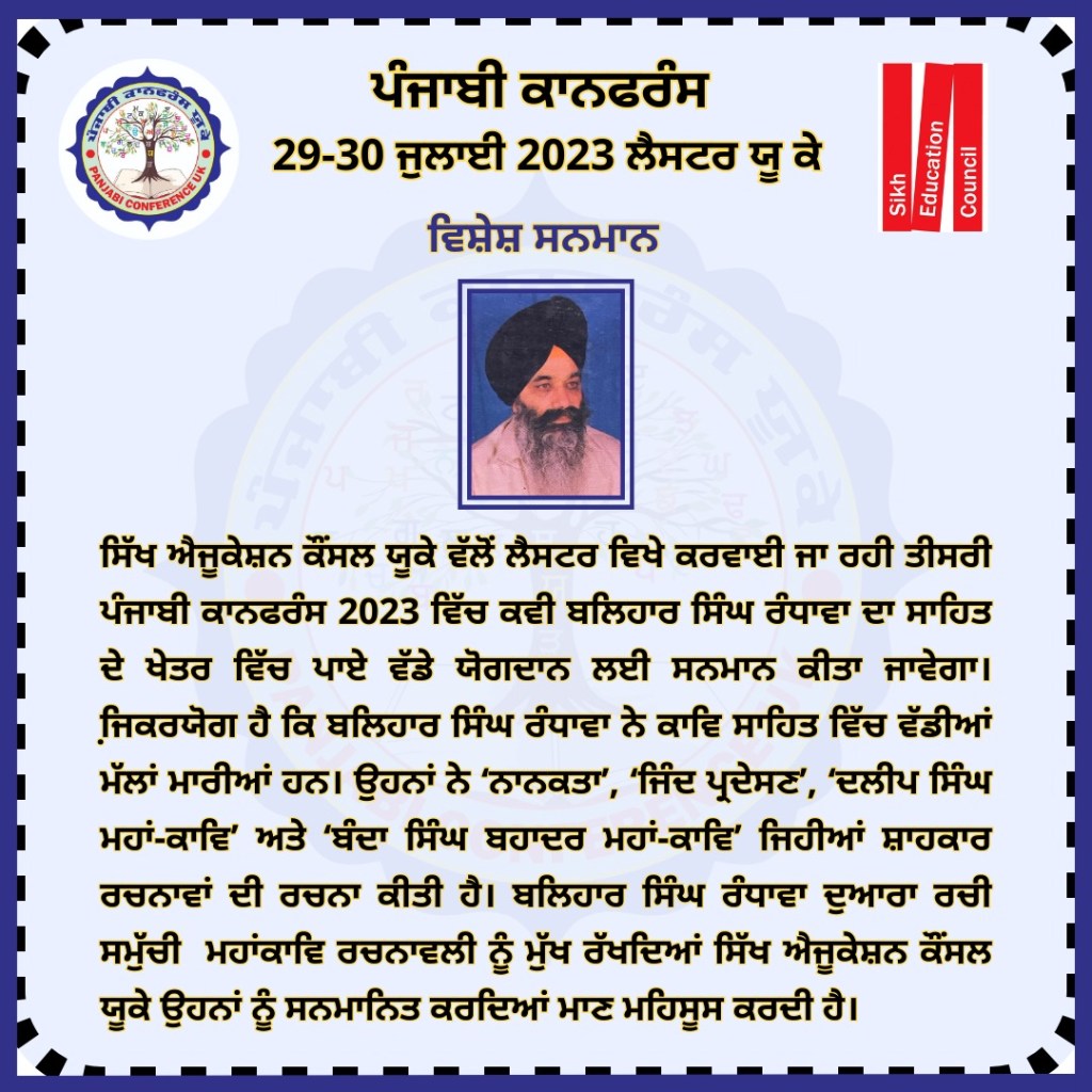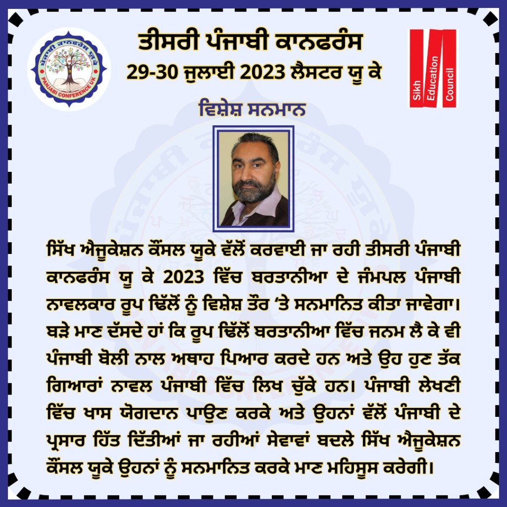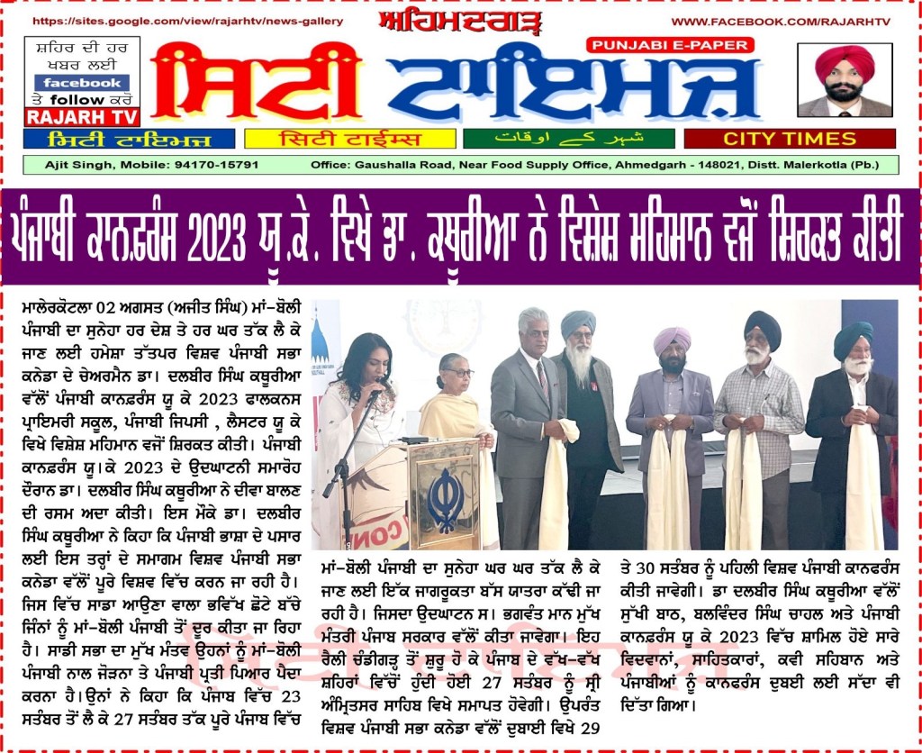 ਪੰਜਾਬੀ ਕਾਨਫ਼ਰੰਸ ਯੂਕੇ 2023 ਪੰਜਾਬੀ ਕਾਨਫਰੰਸ ਯੂਕੇ 2023 ਵਿੱਚ ਪੜ੍ਹੇ ਗਏ ਪਰਚੇ ਕਾਨਫ਼ਰੰਸ ਦਾ ਸਥਾਨ : Falcons Primary School, Gipsy Ln, Leicester LE5 0TA ਪੰਜਾਬੀ ਦੇ ਵਿਕਾਸ ਵਿੱਚ ਹਿੱਸਾ ਪਾਉਣ ਵਾਲੀਆਂ ਸ਼ਖ਼ਸੀਅਤਾਂ ਦਾ ਸਨਮਾਨ ਕੀਤਾ ਗਿਆ। ਪੰਜਾਬੀ ਕਾਨਫਰੰਸ ਯੂਕੇ 2023 ਵਿੱਚ ਪੜ੍ਹੇ ਗਏ ਪਰਚੇ ਪੰਜਾਬੀ ਕਾਨਫਰੰਸ ਯੂਕੇ ਮੁੱਖ ਪੰਨਾ